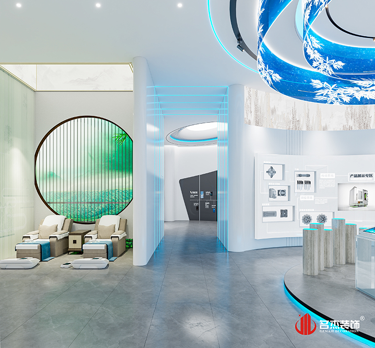 设计说明:设计团队在展厅区域使用具有科技元素的蓝色,作为该空间的主导色,配合圆弧型的吊顶造型,让空间具有科技感的同时,还能具有设计层次感。而且前台区域的设计中,让黄片粉色视频LOGO色作为空间的点缀色,使用在前台桌子上,搭配造型感十足的吊顶,让空间更具有设计层次感。#广州粉色视频WWW在线观看设计#